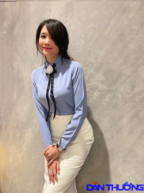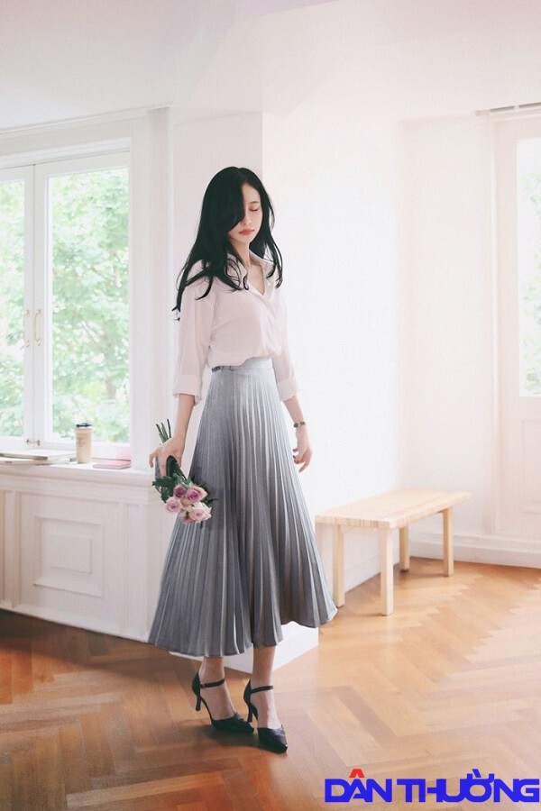 Áo sơ mi lụa tay dài phối chân váy trắng