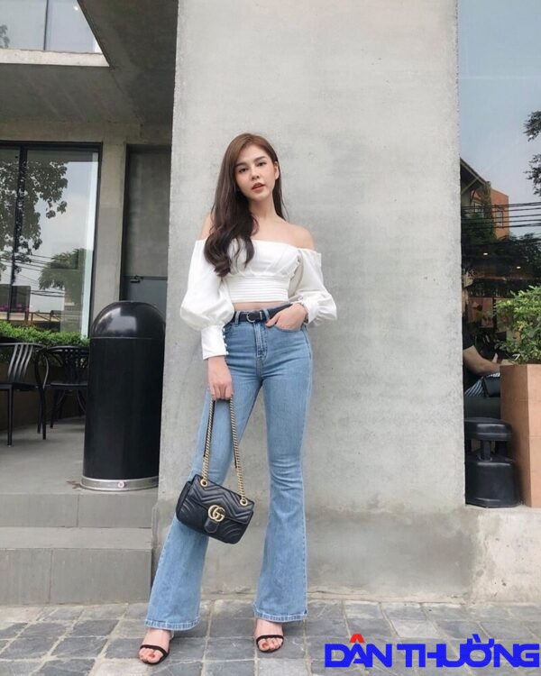 Áo thun kiểu hở vai phối chân váy jean thêu hoa