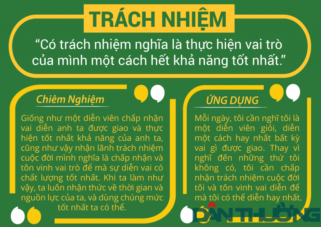 Hiện nay trong cuộc sống cũng như trong mọi công việc, trách nhiệm là một yếu tố cần phải được đưa lên hàng đầu. Bởi nếu ai cũng làm việc có trách nhiệm, sống có trách nhiệm thì cuộc sống sẽ tốt đẹp hơn rất nhiều. Chủ động, sáng tạo, dám nghĩ, dám làm, dám chịu trách nhiệm; nói đi đôi với làm, đã nói thì phải làm; không lùi bước trước mọi khó khăn khi thực hiện nhiệm vụ được giao; làm việc bằng mọi khả năng, công sức; chống bệnh lười biếng, lối sống hưởng thụ, nói không đi đôi với làm, nói nhiều làm ít.